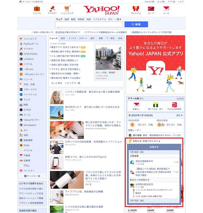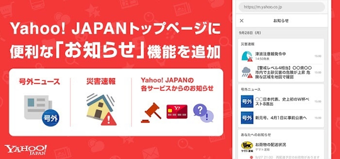 ヤフー Yahoo Japan トップページに災害速報や宅配便の配送状況などを一覧で確認できるお知らせ機能を追加 日本経済新聞